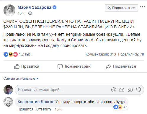 Официальный представитель Министерства иностранных дел России Мария Захарова в Facebook прокомментировала решение Госдепартамента США перенаправить на другие цели $230 млн, которые изначально планировалось направить на стабилизацию Сирии.